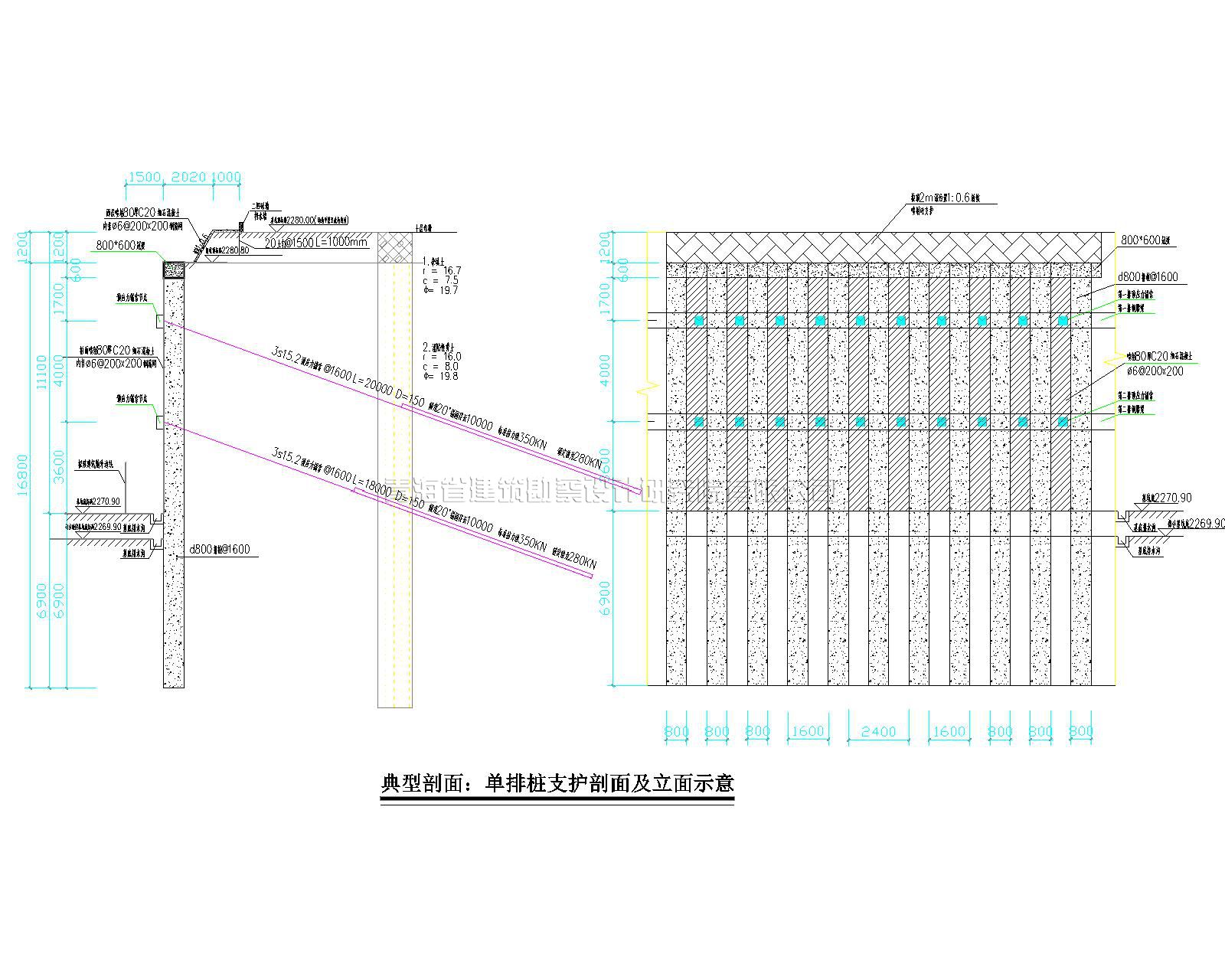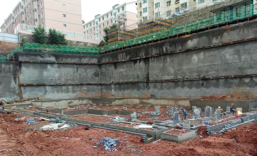 根據(jù)現(xiàn)場地質(zhì)條件及基坑周邊環(huán)境,依據(jù)《建筑基坑支護技術規(guī)程》(JGJ120-2012)及《濕陷性黃土地區(qū)建筑基坑工程安全技術規(guī)程》(JGJ167-2009)規(guī)定確定;基坑北側(cè)及西側(cè)基坑深度為8.6-10.0m,支護結(jié)構(gòu)安全等級為為二級;其余兩側(cè)(東側(cè)及南側(cè))開挖深度在9m-12.1m之間,支護結(jié)構(gòu)安全等級為一級。此次支護基坑側(cè)壁安全等級為一級。本著安全穩(wěn)定、經(jīng)濟合理的原則,本次基坑支護設計采用排樁+預應力及懸臂樁等綜合性,分段性的支護支護方式進行。基坑支護設計工作于2018年完成,并于次年通過青海省建設工程勘察設計咨詢中心有限公司審查合格。