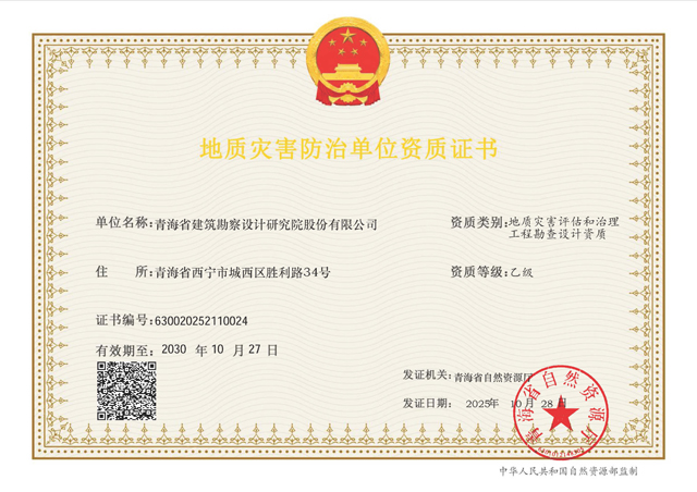 近日,公司獲得由青海省自然資源廳頒發(fā)的“地質(zhì)災害評估和治理工程勘查設計資質(zhì)(乙級)”,標志著公司在地質(zhì)災害防治領域的業(yè)務能力和專業(yè)實力邁上新的臺階。